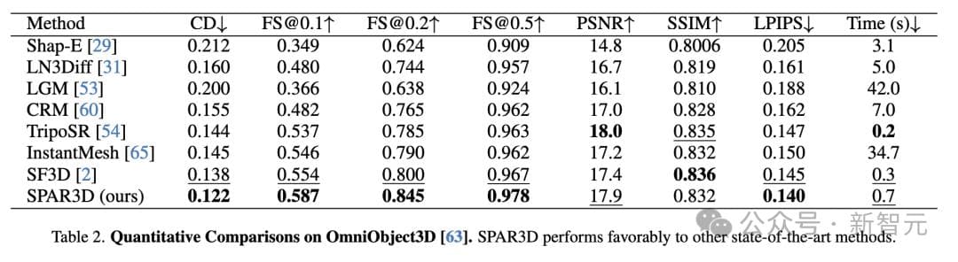 如表1和表2所示,SPAR3D在这两个数据集的大多数指标上显著优于所有其他回归或生成基准方法。