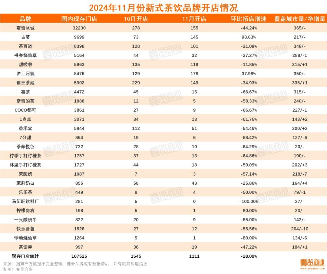 据艾媒咨询数据显示,2024年中国新式茶饮市场规模预计达到3547.2亿元,并有望在2028年突破4000亿元大关。而据茶咖观察截至11月的数据,25家新茶饮连锁品牌一共新开门店1111家,数量与上月相比减少434家,新开门店总量环比减少28.09%,较去年同比减少68.22%,现存门店一共107525。窄门餐眼数据则显示,截至2024年8月5日,全国奶茶饮品门店总数已达43.18万家,过去一年新增门店16.73万家。一方面是市场的膨胀,另一方面是品牌门店数量的缩减,这说明茶饮市场将逐步转化为精细化运营。