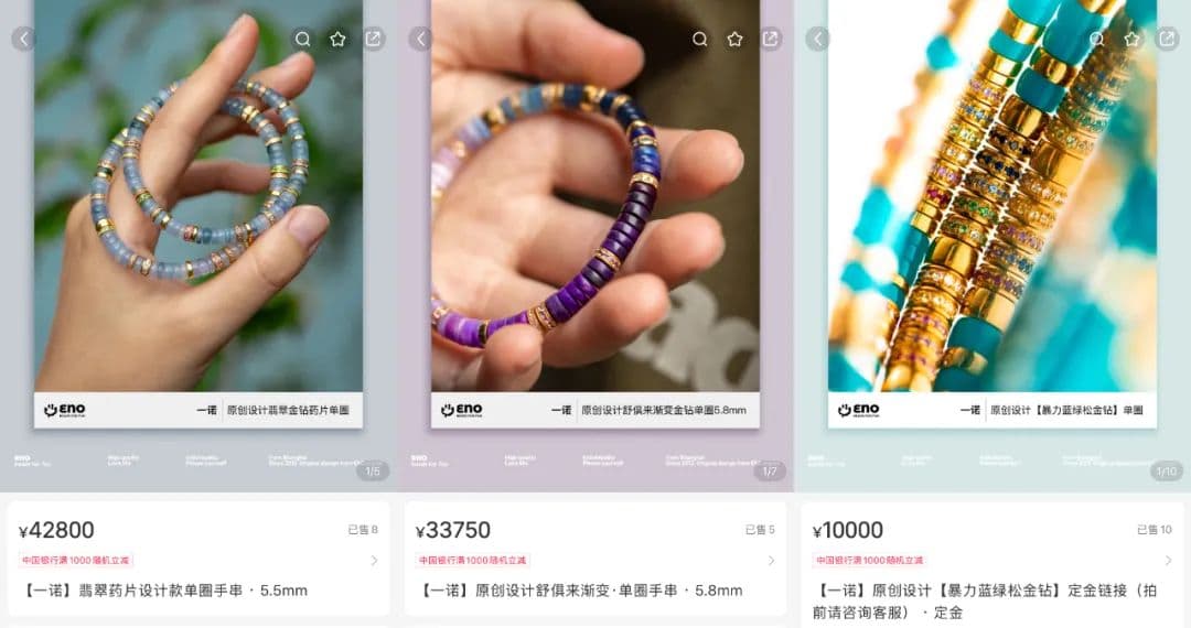 作为小红书上文玩珠宝品类的现象级品牌,"一诺本诺"最出名的产品是各类用料昂贵、设计精美的"新中式手串"。它的设计款产品客单价超过1.5万,金钻系列仅定金就要1万块,普通款式的价格也在几百到数千元不等。但在大家都嚷着消费降级时,"一诺本诺"2023年达到了上亿元的交易额。