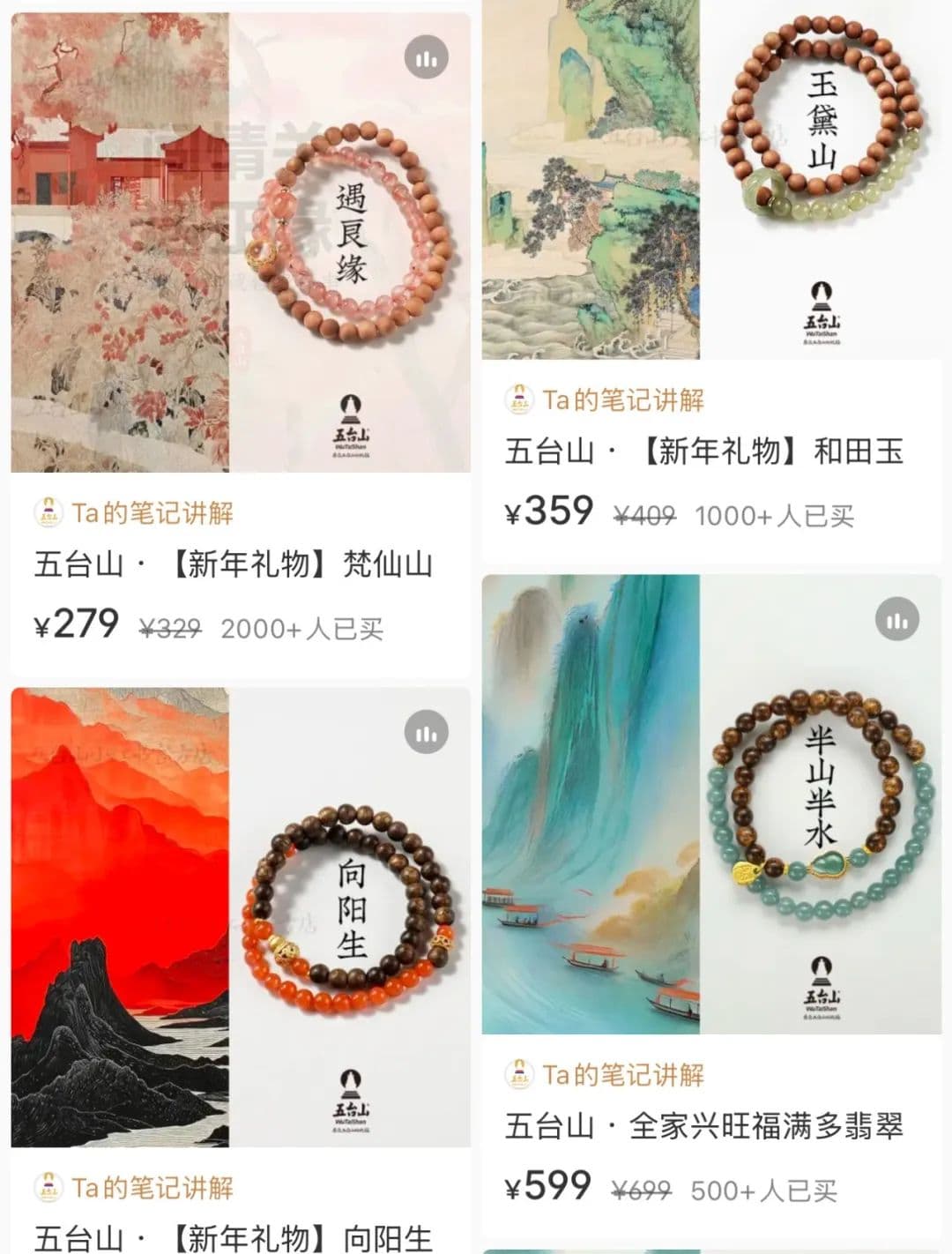 一些商家会在新中式的包装上做文章。比如五台山官旗店会给自己的手串取名“玉黛山”“向阳生”并在封面配上中式水墨画,另一家主打新中式、拥有8.4万粉丝的文玩品牌“山莳Sylvan”,则会给自己的产品取名“金胭岁禧”“观山晓月”。
