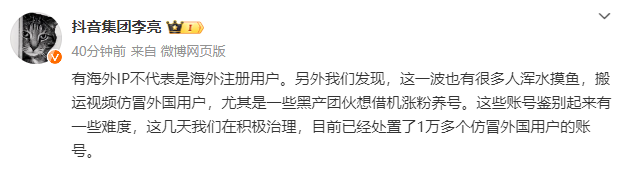 抖音副总裁:已处置1万多个仿冒外国用户的账号