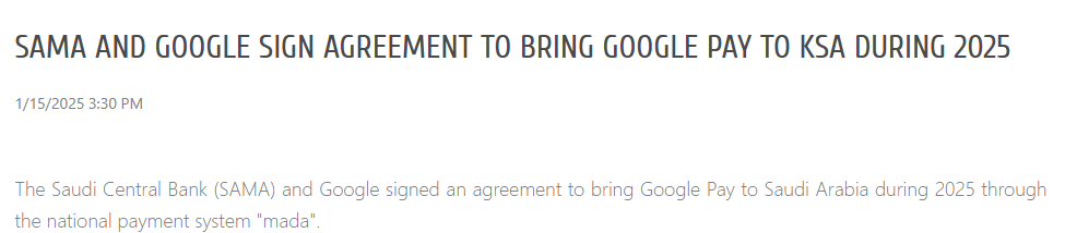 财联社1月16日讯(编辑 李林/实习编辑 童焕)据报道,沙特中央银行(SAMA)与美国科技巨头谷歌合作,2025年通过沙特全国支付系统mada,将Google Pay引入沙特阿拉伯。