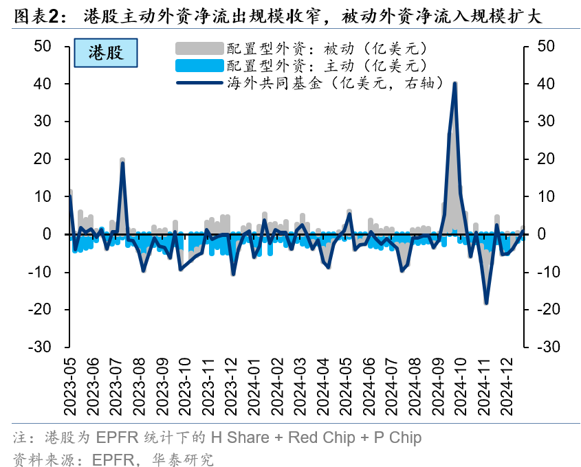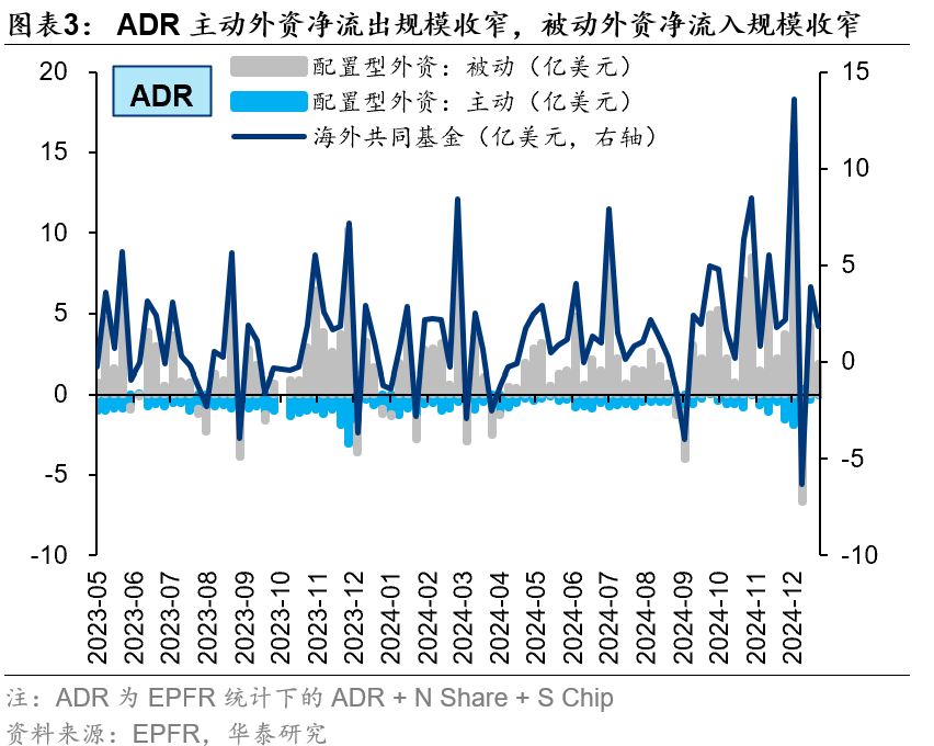 港股主动配置型外资净流出规模收窄。1月2日至1月8日,港股主动外资连续13周净流出,净流出规模收窄至0.93亿美元(vs前一周净流出1.92亿美元),被动外资净流入规模扩大至1.74亿美元(vs前一周净流入0.42亿美元);ADR主动外资净流出规模收窄至0.05亿美元(vs前一周净流出0.33亿美元),被动外资净流入规模收窄至1.84亿美元(vs前一周净流入4.21亿美元)。