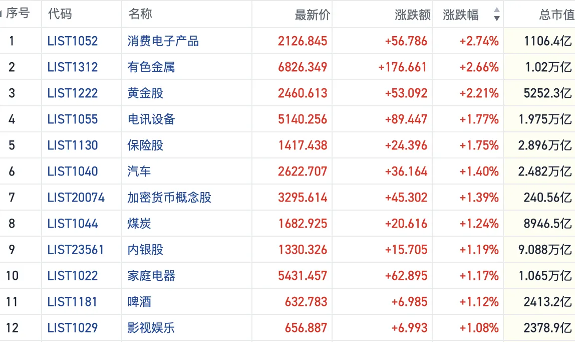 其他热点方向上,黄金、有色金属股表现活跃。此外,汽车、家电、钢铁等板块普涨,金融股集体走强。
