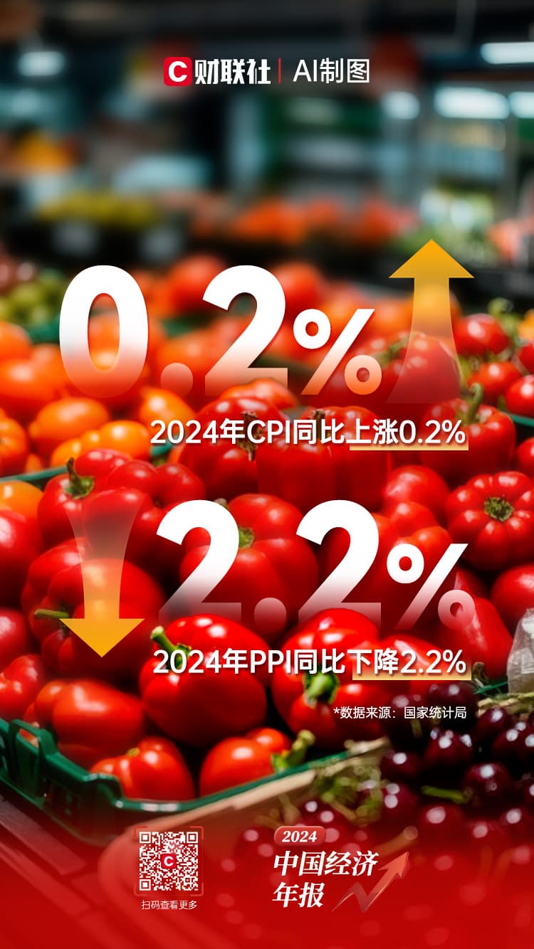 CPI:2024年,居民消费价格同比上涨0.2%,12月份同比上涨0.1%。