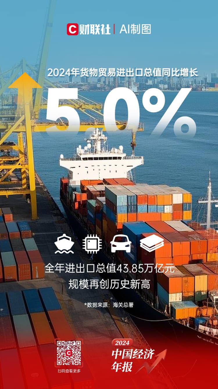 进出口:2024年,我国货物贸易进出口总值43.85万亿元人民币,贸易规模再创历史新高,同比增长5%。