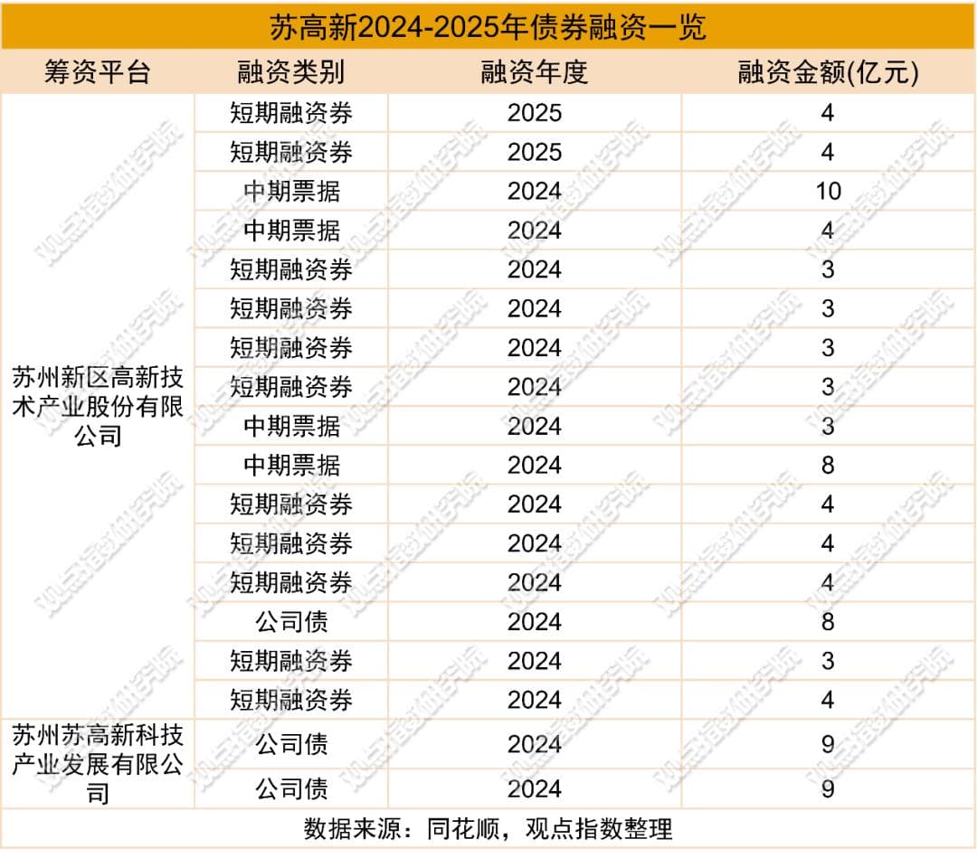 和其他产业企业不同,据观点新媒体不完全统计,自2024年到2025年1月8日,苏高新共发行18笔债券,远超其他产业企业。