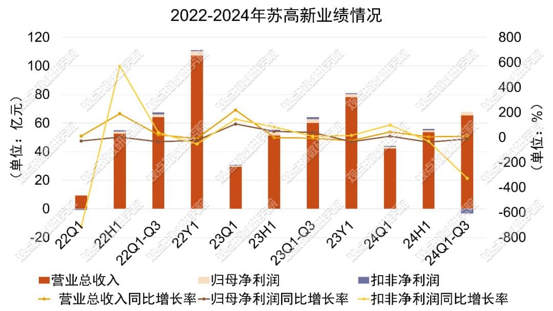 据苏高新2024年三季度业绩报告,第三季度营业收入为11.84亿元,同比增长38.39%,归属于上市公司股东的净利润为9445.17万元,同比增长124.48%,归属于上市公司股东的扣非净利润为-4.24亿元。