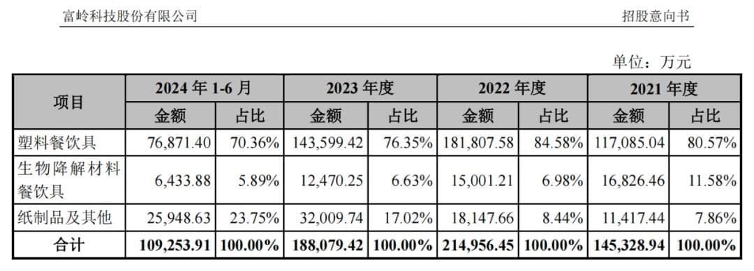 招股书显示,恒鑫生活可降解产品的毛利率接近40%,不可降解产品的毛利不到30%。从2021年以来,其可降解产品的收入占比正在逐年提升,到2024年上半年已达到57.63%。同期,富岭股份的可降解材质餐饮具占比只有5.89%。这也是两家公司收入体量差了6个亿,但净利润水平接近的主要原因。