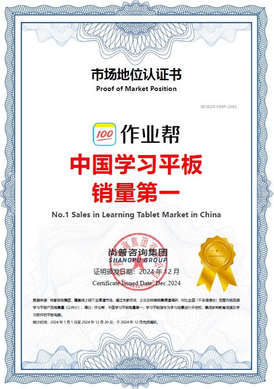 尚普咨询市场分析报告指出,作业帮学习机在2024年全年的国内全渠道销量(不含港澳台地区)位居中国第一;