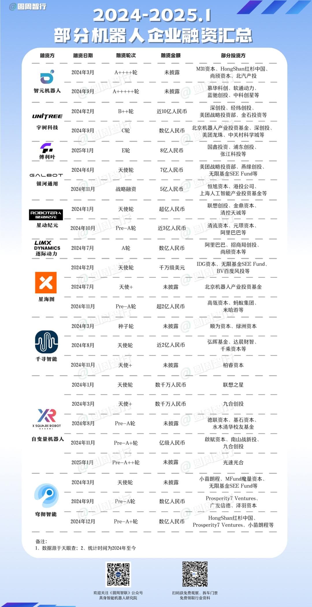 同时,业内普遍认为,2025年将是人形机器人量产元年。人形机器人企业蓄势待发,其实,观察目前的机器人融资情况便初见端倪。
