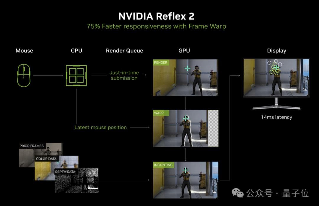 为此英伟达推出了Reflex 2,将上一代Reflex的低延迟模式与全新Frame Warp技术相结合,在将渲染帧发送至显示器前,根据最新的鼠标输入信号对其进行更新,可将PC延迟降低高达 75%。