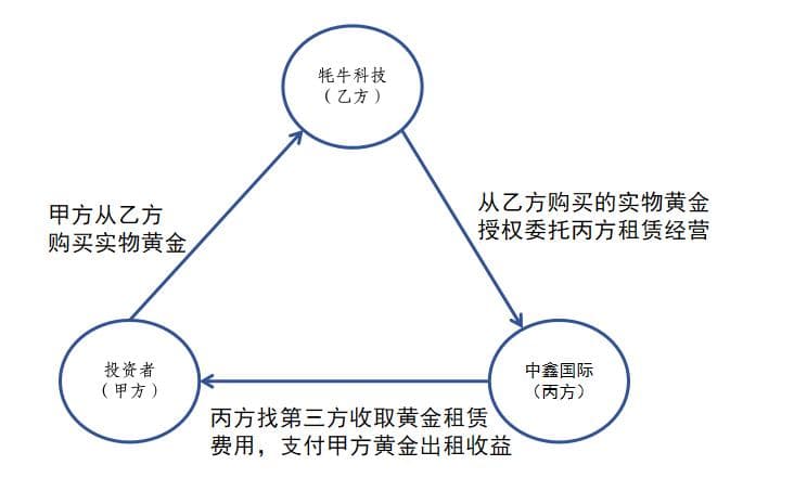 华侨系70亿元诈骗案的交易闭环为:投资者作为甲方,向乙方侨行天下运营主体——牦牛信息科技(杭州)有限公司(下称“牦牛科技”)购买实物黄金。甲方从乙方购买的实物黄金授权委托丙方中鑫国际融资租赁(深圳)有限公司(下称“中鑫国际”)租赁经营,丙方和第三方合作赚取的黄金租赁费用,按照约为8%的年化收益率给到甲方。