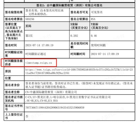 电子签名业内四个步骤往往由不同服务商所提供,上上签显示华侨系投资者通过E签宝签署的合同由黑龙江省数字证书认证有限公司所提供。时间戳服务提供者为e签宝专用时间戳:timestamp.esign.cn。