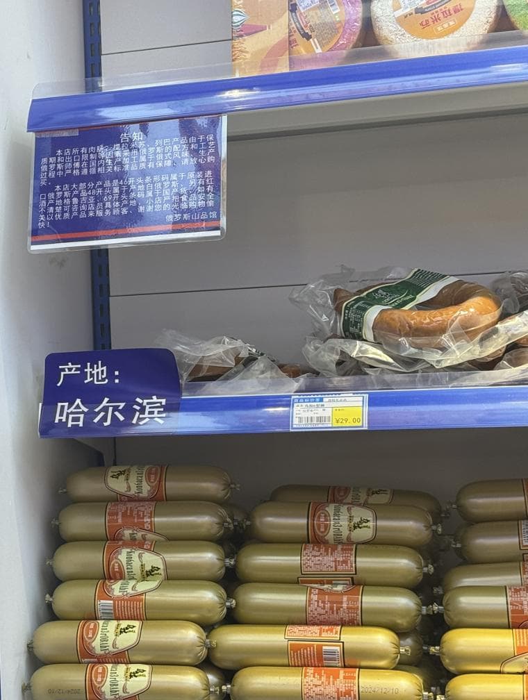 新消费日报记者也留意到,现下店内不少商品依然存在原产地标注混淆、易误导消费者的问题。如店内一款名为“乌拉U型肠”的商品,价格标签上写着“产地:俄罗斯”,但在其左侧的告知上却标注“产地:哈尔滨”。
