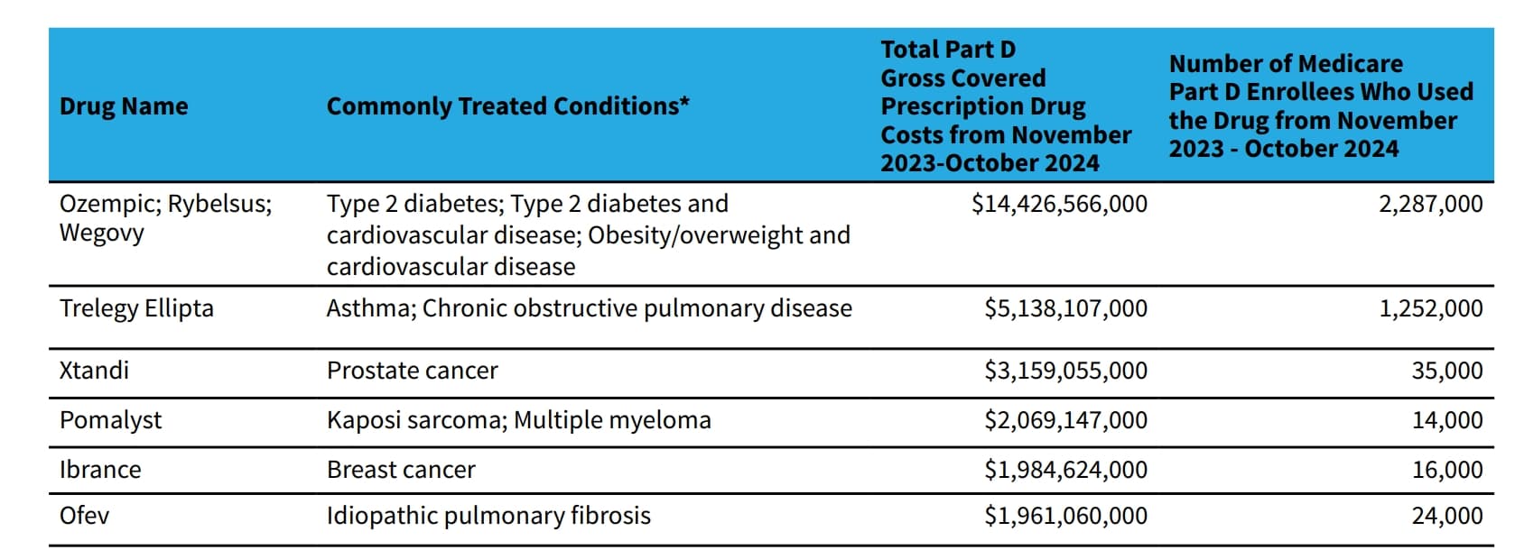根据美国卫生和公共服务部的消息,约有530万美国人在2023年11月至2024年10月之间使用这15种药物,联邦医保的处方药保险(Part D)为此支付了约410亿美元的费用,占到报告期内总花费的14%。