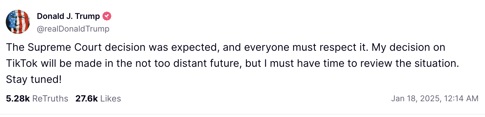 特朗普周五在其个人社交媒体平台Truth Social发文称:“最高法院的裁决是意料之中的,所有人都必须尊重。我对TikTok的决定将在不久的将来做出,但我需要时间来审视这一情况。敬请期待!”