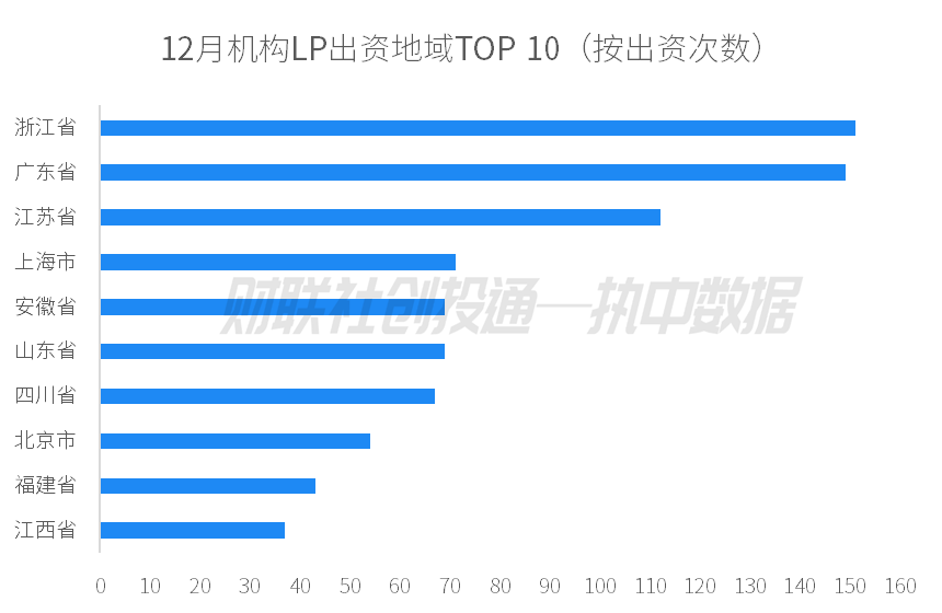 从地区来看,12月备案基金的机构LP中,浙江省出资次数及规模跃居首位。从出资活跃度来看,浙江、广东、江苏出资次数均在100次以上,位居前三,累计占比约41%;与上月相比,四川、江西活跃度有所提升,进入出资活跃榜前十。