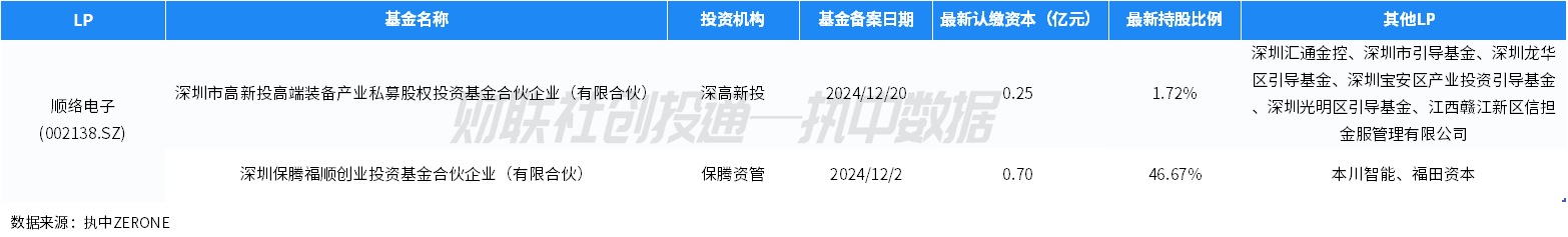 其中,顺络电子(002138.SZ)出资了深圳市高新投高端装备产业私募股权投资基金合伙企业(有限合伙)和深圳保腾福顺创业投资基金合伙企业(有限合伙)两支备案基金,累计认缴资本9500万元,为12月出资最活跃的上市公司LP。