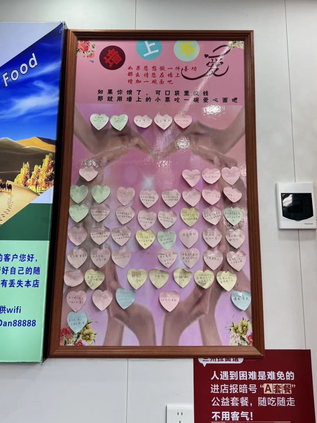 青海人韩四力毛同样顾虑到了吃免费餐的客人的面子问题。他在广州白云区经营着一家高原精品拉面馆,店面不大,进店右手边有一面“爱心墙”,上面写着,“如果你饿了,可口袋里没钱,那就用墙上的小票吃一碗爱心面吧。”韩四力毛说,如果没钱吃饭的客人羞于开口,只需从墙上撕下一张便利贴交给店员即可。