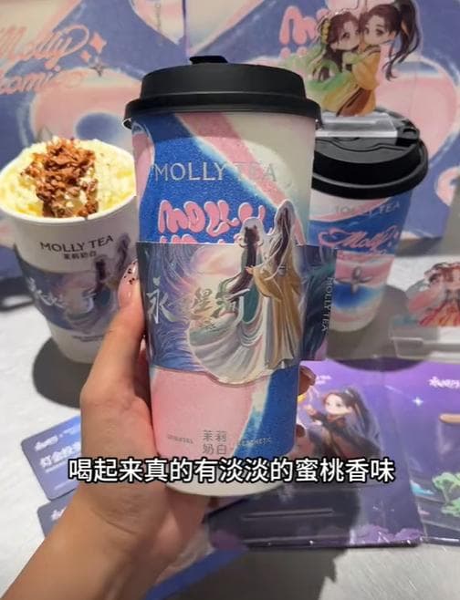 除了喜茶,还有前段时间,茉莉奶白和电视剧《永夜星河》的联名款,也相当抢手。