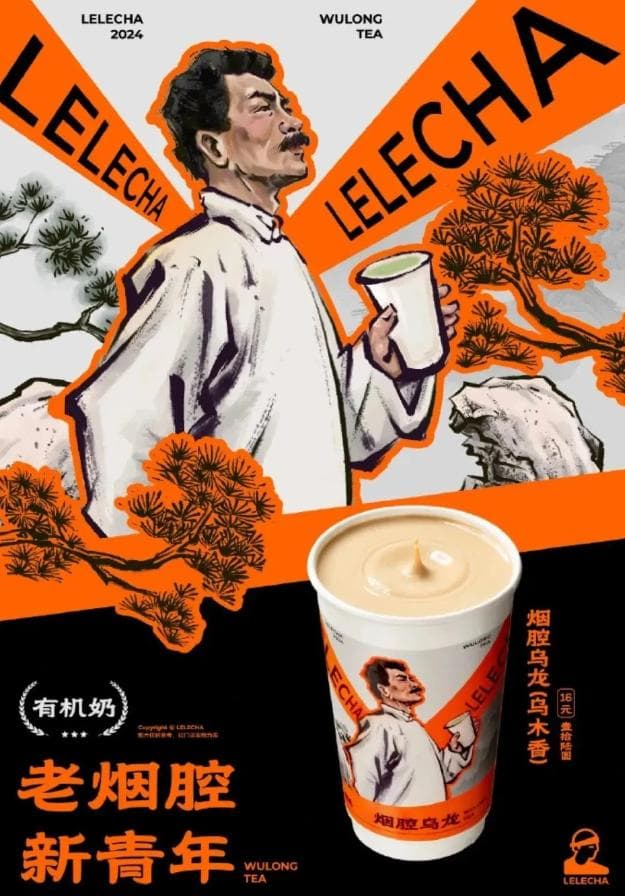 例如,乐乐茶去年推出了一款名为 “ 烟腔乌龙 ” 的联名奶茶, 在推广中,不但将鲁迅先生的半身像印在杯身,还有一系列的亚克力立牌、贴纸等产品也印上了,且一并使用了 “ 老烟腔,新青年 ” 的宣传字样。