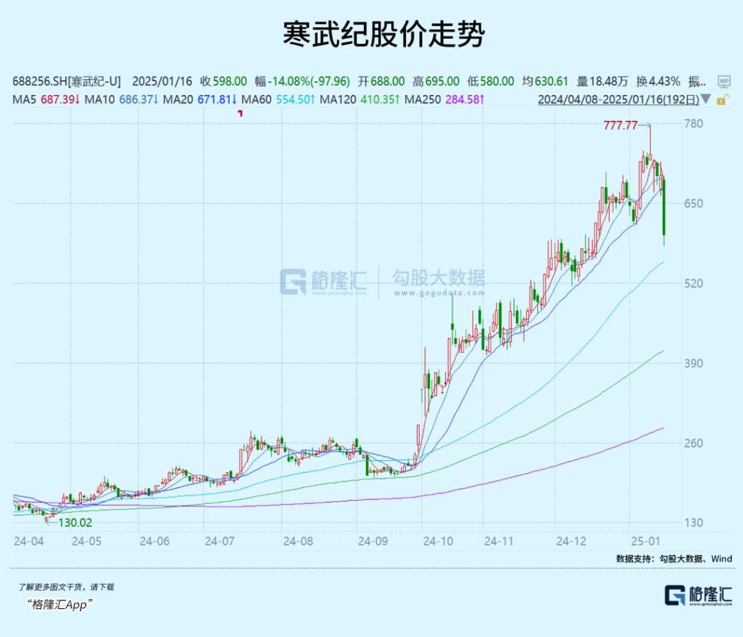 1月10日,寒武纪股价最高见777.77元,市值最高超3200亿元,自去年“924”以来累计飙涨高达2.5倍,被不少投资者亲切地称为“寒王”。