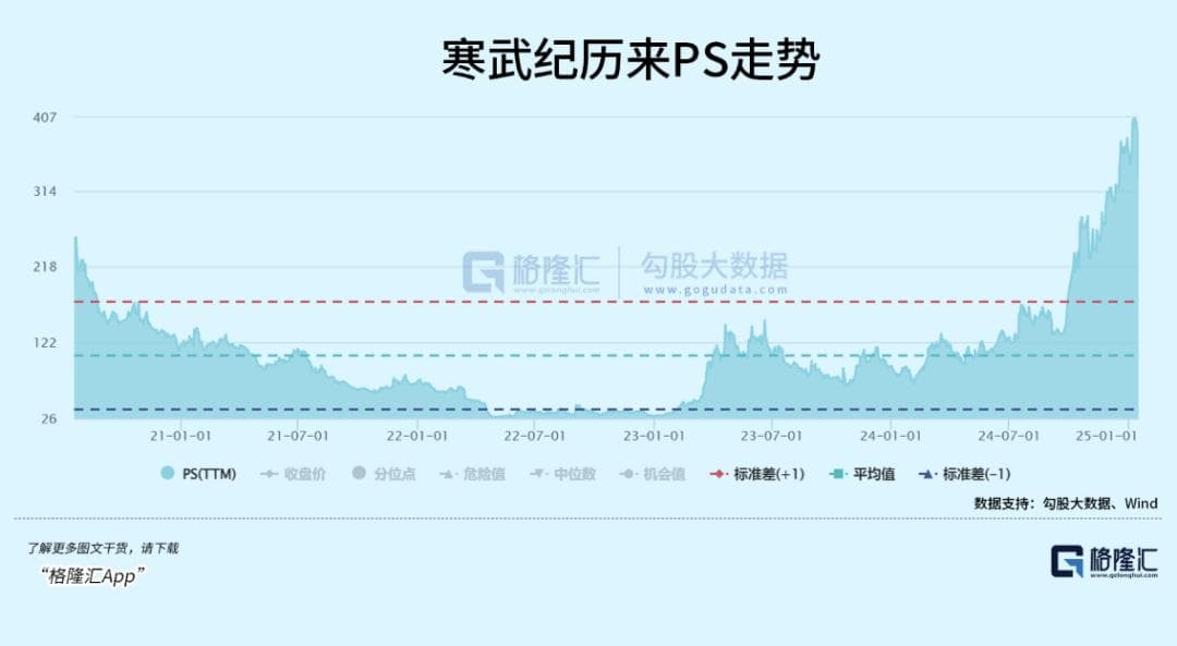 当前,寒武纪PS(市销率为市值/营收,即评估尚未盈利或盈利不稳定的高成长性企业的价值)为331倍,远高于上市以来估值中位数的96.9倍,较2023年1月的不足30倍翻了10倍以上(可见市值暴增均来源于估值提升)。