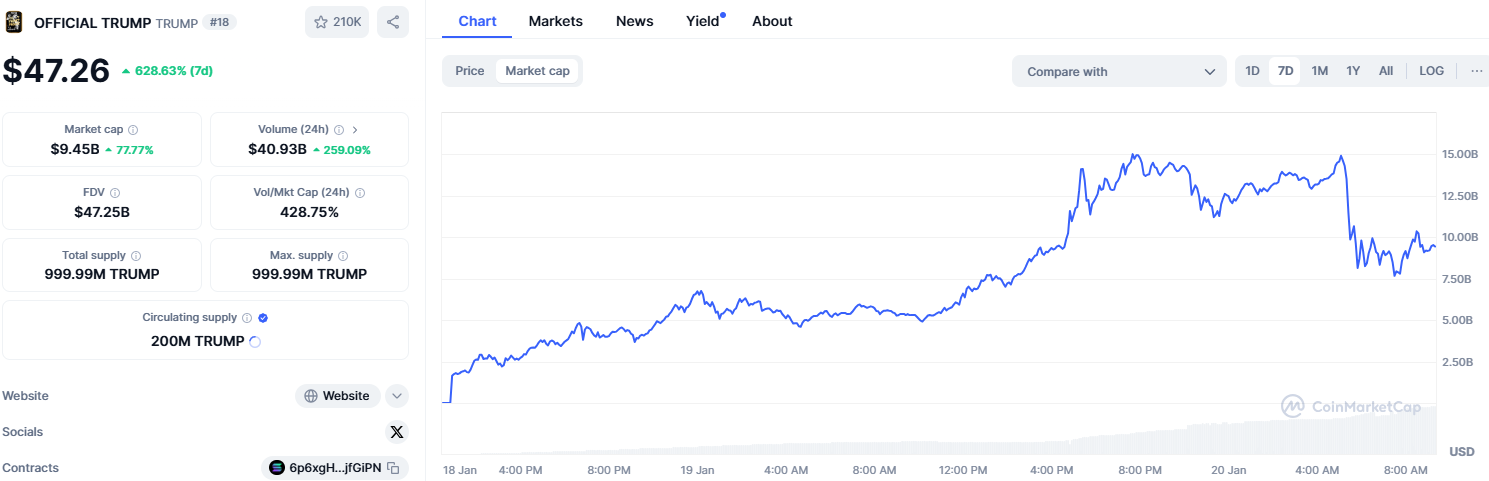 而在特朗普夫人梅拉尼娅上周日发行自己的梅拉尼娅币之后,特朗普币快速回落,目前其市值降至100亿美元以下,价格从最高点近75美元降至目前的45.47美元。与此同时,梅拉尼娅币则一路飙高,价格涨幅超过50%。