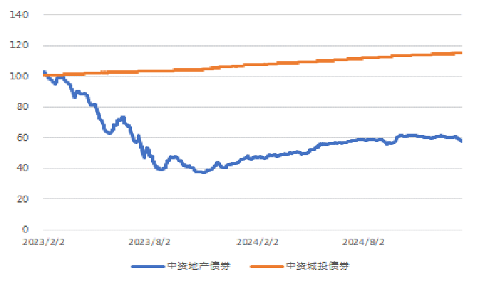 图2. 中资房地产、城投板块美元债指数走势(基准=100)
