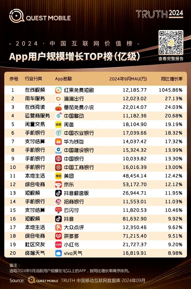 根据权威数据机构 QuestMobile 的数据显示,2024年9月,红果短剧的月活跃用户数(MAU)已成功突破1.2亿大关,同比增长幅度高达1045.9%。 另外,红果短剧的人均单日使用时长也达到了惊人的60分钟左右。