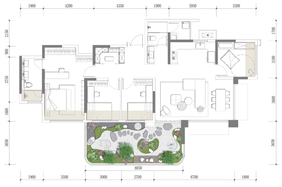 该户型还设有另一个户外花园空间,创造了一个被双花园包围的无界茶室或书房,这种创新设计打破了室内外空间的传统隔阂,使得交流、阅读和休息等活动都可以围绕花园展开。