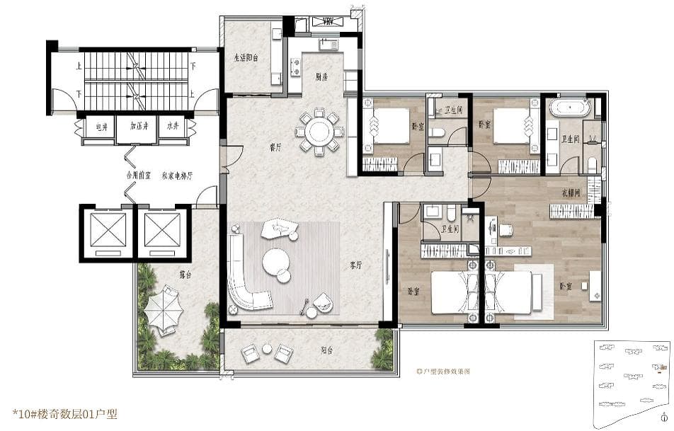 第二处户外花园与茶室和长辈套房相邻,一侧直接连接茶室,另一侧则与长辈的房间相通,这样的布局还原了老年人的日常活动场景,如早晨的锻炼、午后的品茶和园艺,为长辈营造了一个充满度假感的生活空间,体现了对长辈的关怀与尊重。