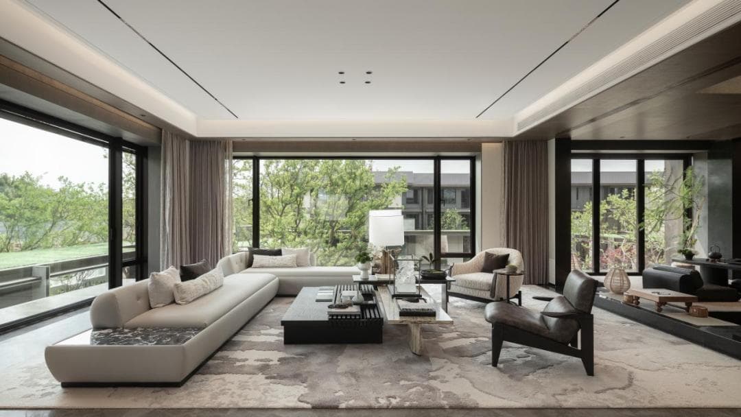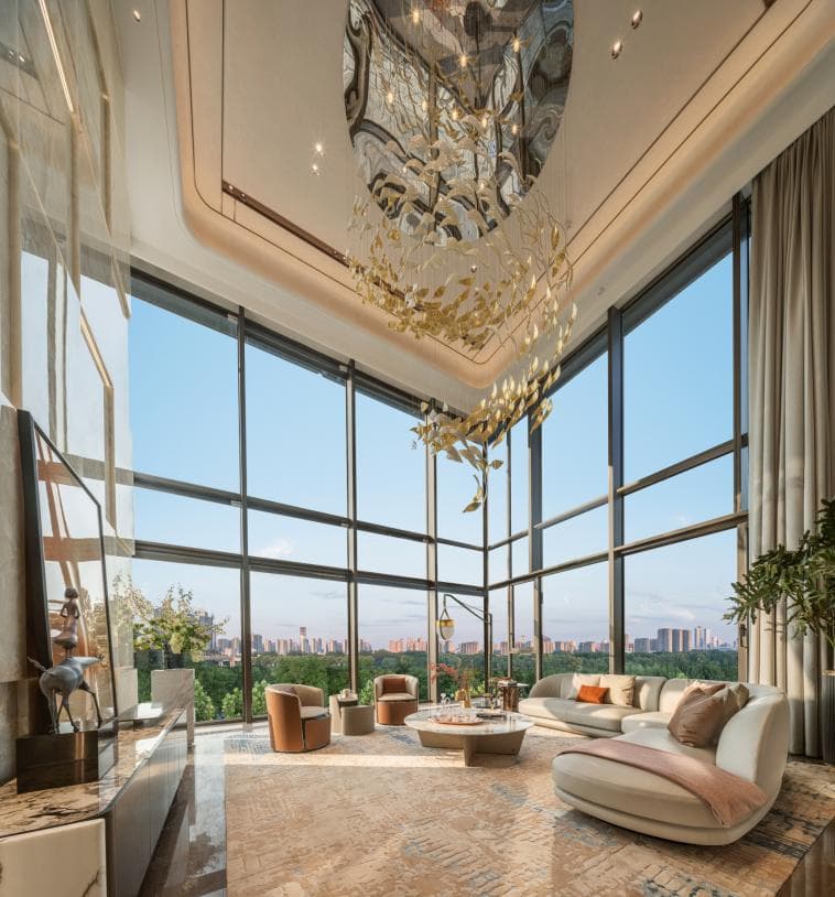 从客厅效果看,两层通高的客厅被全落地窗环绕,使得客厅的光线更加充裕,同时提供了更为广阔的视野,不仅在视觉上拉伸了空间,也为居住者带来了270°的环幕观景体验。高层产品的别墅级客厅,强化纵向尺度,显著增强了高端产品的居住空间体验。
