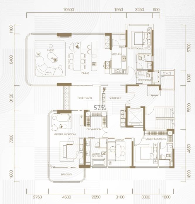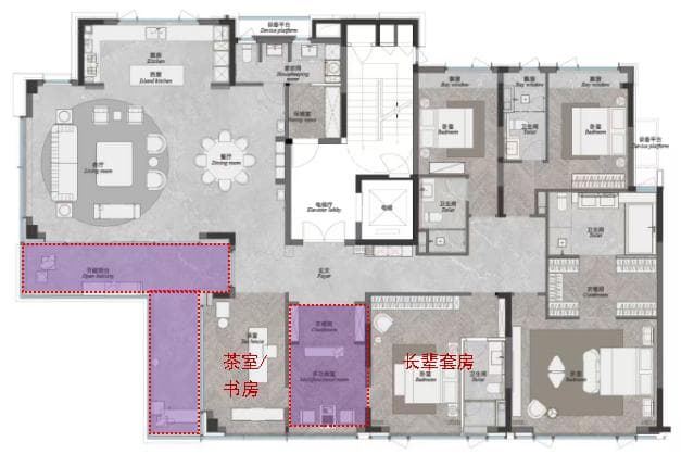 合肥越秀观樾的创新则是将别墅摊开,其户外庭院景观移至大平层的不同分区中,打造平层化别墅。311㎡户型有着多重户外花园,可以组成不同的生活场景。约74㎡的三合一(客厅、餐厅、中厨)巨厅,搭配约15㎡的L型户外客厅,组成户外花园系统,可以容纳各种类型的家庭宴会、派对。