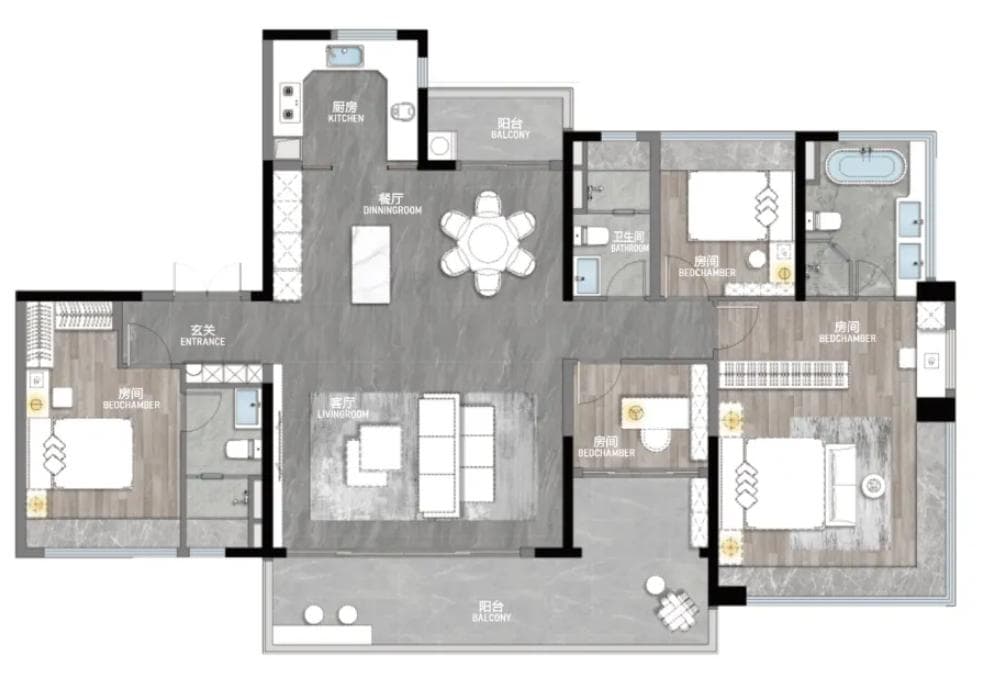 以具备典型四代宅特征的北京龙湖中关村·观萃为例,其阳台采用奇偶错层排布设计,挑高可达6米,部分户型可以形成270°转角空间,为居住者提供了更加丰富和多元的生活场景。