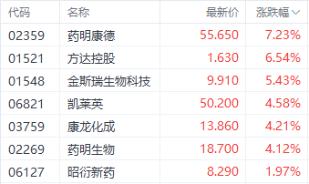 首先是医药股表现居前。截至收盘,药明康德(02359.HK)、方达控股(01521.HK)、金斯瑞生物科技(01548.HK)分别上涨7.23%、6.54%、5.43%。