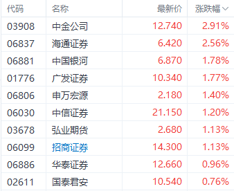 最后是券商股。截至收盘,中金公司(03908.HK)、海通证券(06837.HK)、申万宏源(06806.HK)分别上涨2.91%、2.56%、1.40%。
