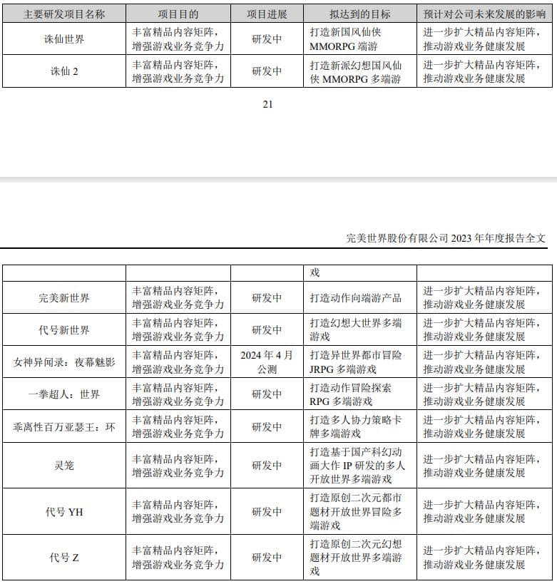 2023年年报显示,完美世界还在研发中的项目有《诛仙世界》《诛仙2》《完美新世界》《代号新世界》《一拳超人:世界》《乖离性百万亚瑟王:环》《灵笼》《代号YH》《代号Z》。