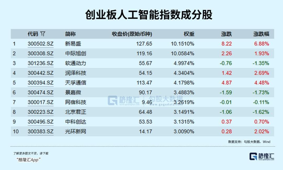 其他十大权重还有第三大权重股、英伟达概念--软通动力,第七大权重股、国产GPU概念--景嘉微,以及多个AI应用代表公司--同花顺、润和软件、网宿科技、北京君正、中科创达。