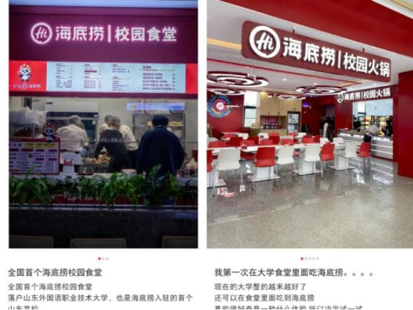 海底捞多倾向于入驻高校食堂,例如,在山东外国语职业技术大学的食堂内开设了全国首个海底捞校园食堂窗口店,以及在西安文理学院以“校园火锅店”的形式入驻。