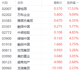 首先是房地产股。截至收盘,碧桂园(02007.HK)、万科企业(02202.HK)、融信中国(03301.HK)分别上涨17.53%、9.09%、5.77%。