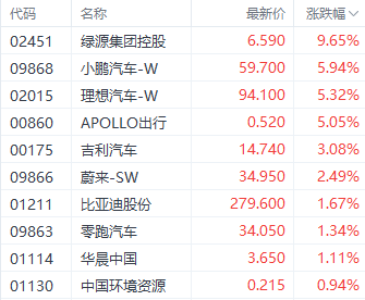 其次是汽车股。截至收盘,小鹏汽车-W(09868.HK)、理想汽车-W(02015.HK)、吉利汽车(00175.HK)分别上涨5.94%、5.32%、2.49%。