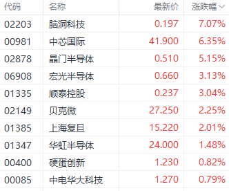随后是半导体股。截至收盘,中芯国际(00981.HK)、上海复旦(01385.HK)、华虹半导体(01347.HK)分别上涨6.35%、2.01%、1.48%。