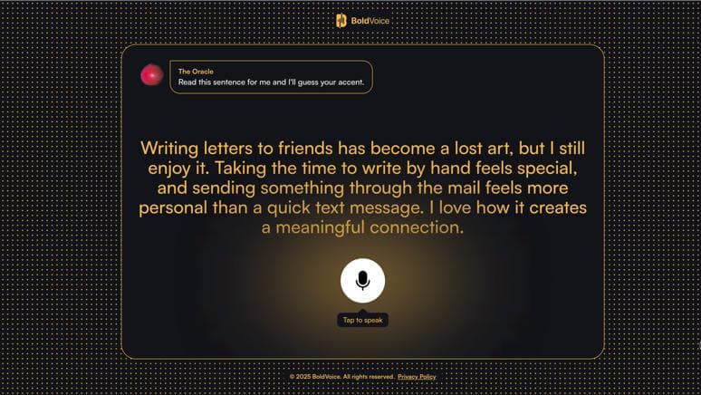 最近,简中互联网上“英语口音测试”突然风靡。玩法很简单,只需要访问特定链接,按照指示录制一段英文语音,数秒后你将会得到一个检测到口音归属国家的结果。(访问网址:https://start.boldvoice.com/accent-guesser)