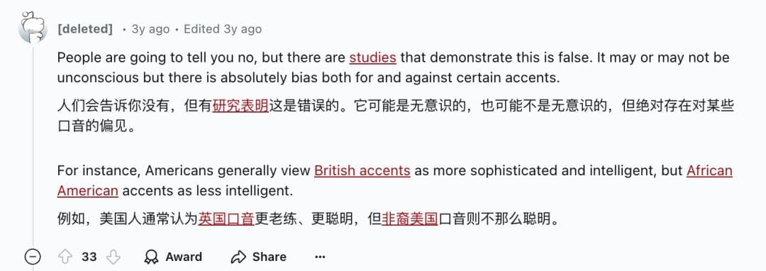 Reddit网友讨论口音偏见问题|图源:Reddit