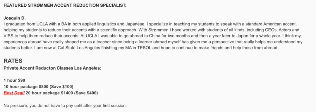 然而要纠正一个人养成多年的发音习惯并不容易,一直以来,市面上最主要的口音问题解决方案是参加真人“口音训练班”,这类课程普遍收费不低。视线上/线下授课、老师经验程度不同,定价在 50 美元/小时到数百美元/小时不等,没有这笔预算的人就只能自学,这也是 Anada Lakra 早年选择的路径,她深知其中的艰辛。所以当 2021 年她听到越来越多有关 AI 和语音模型的消息,她立马意识到自己可以做点什么来帮助非英语母语者来克服口音难题。