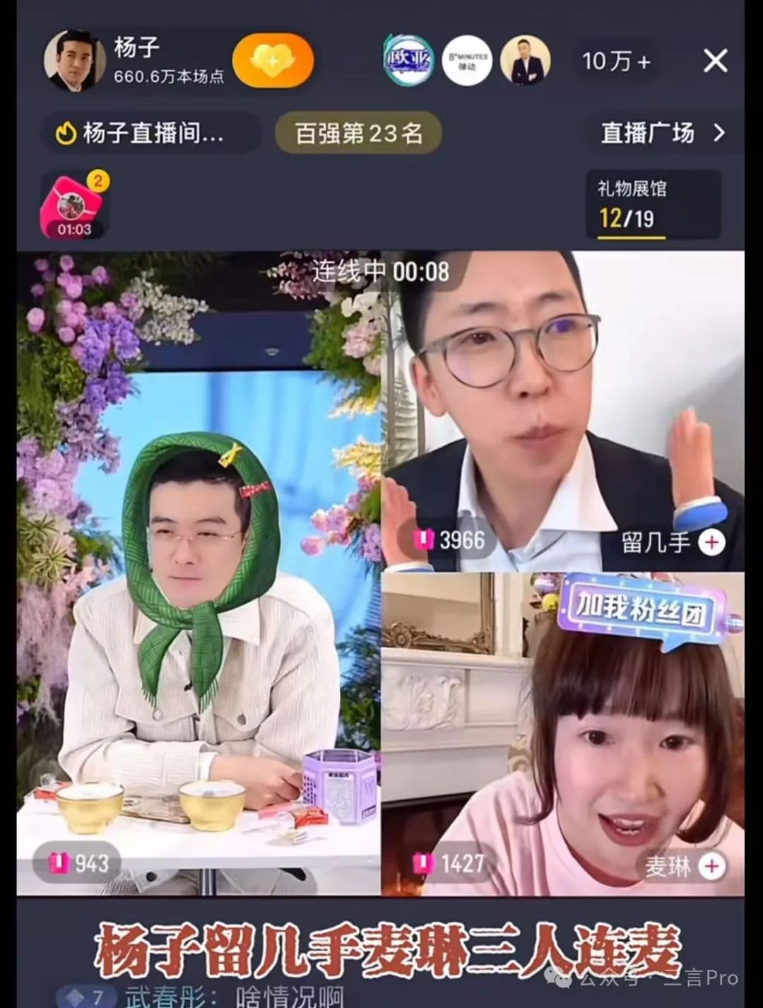 当日的直播中,杨子和其他嘉宾麦琳、留几手进行直播连麦互动。直播间在线人数瞬间超过10万+。
