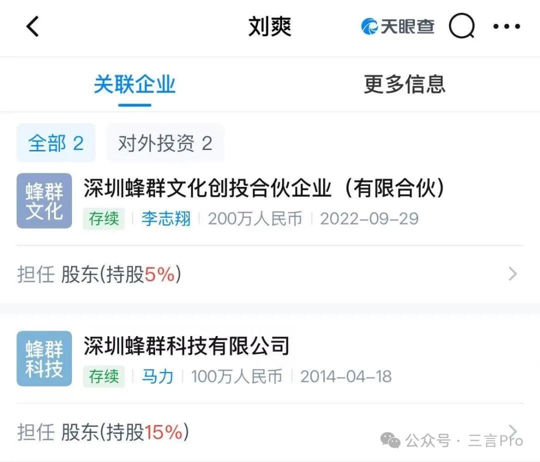 天眼查信息显示,留几手(刘爽)名下关联的2家均为存续状态的企业,都与蜂群文化有关。其中留几手(刘爽)持有深圳蜂群科技有限公司15%的股份。