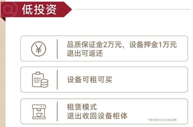在推出店中店模式时,库迪咖啡公布的开店门槛极低,最低仅需保证金5万元,且咖啡机及柜台由公司承担(每个月租金2000元)。后来,门槛进一步降低,库迪公众号显示,店中店的投资门槛仅有3万元,且均为保证金与押金,退出后该笔资金可返还;设备可租可买。